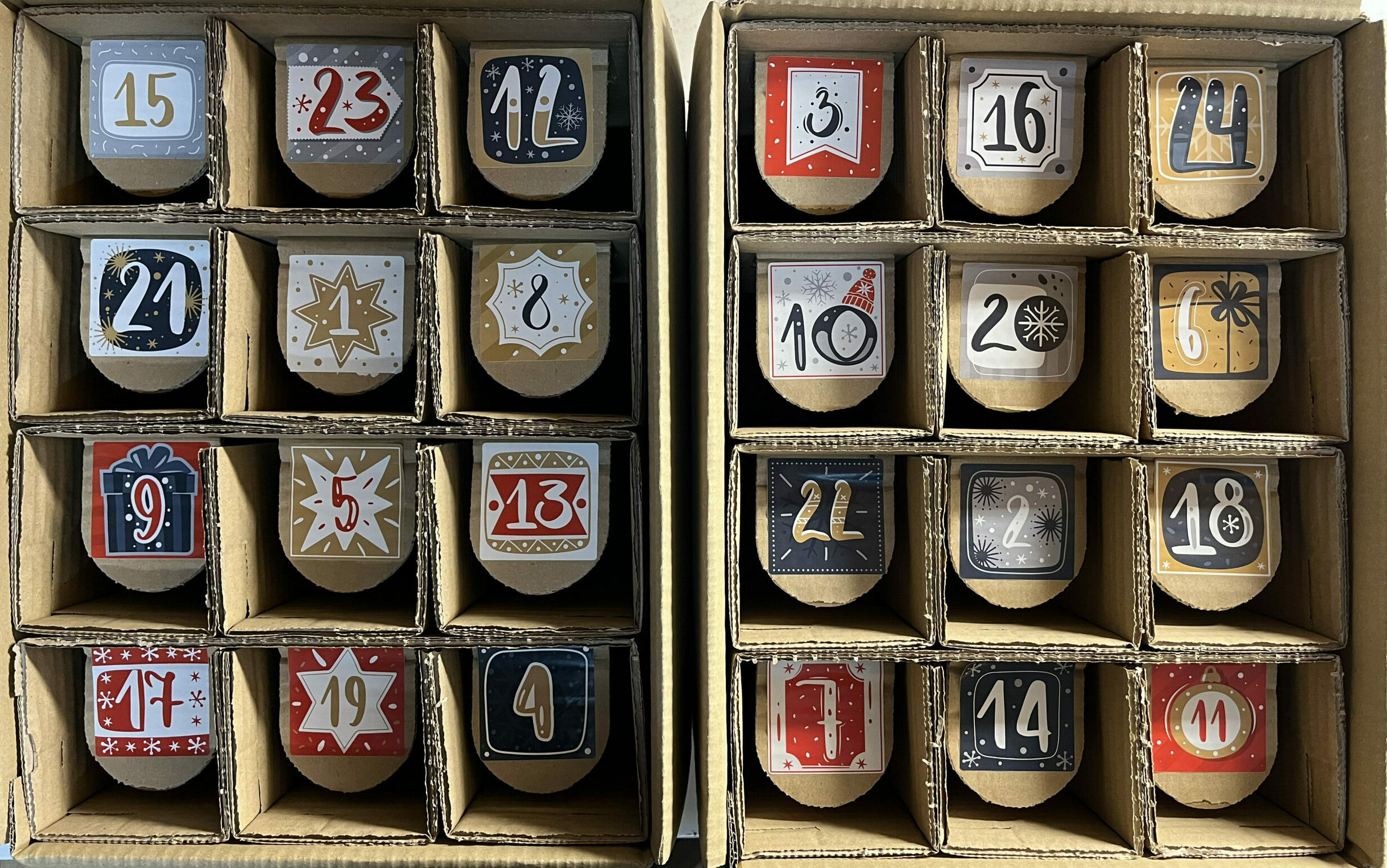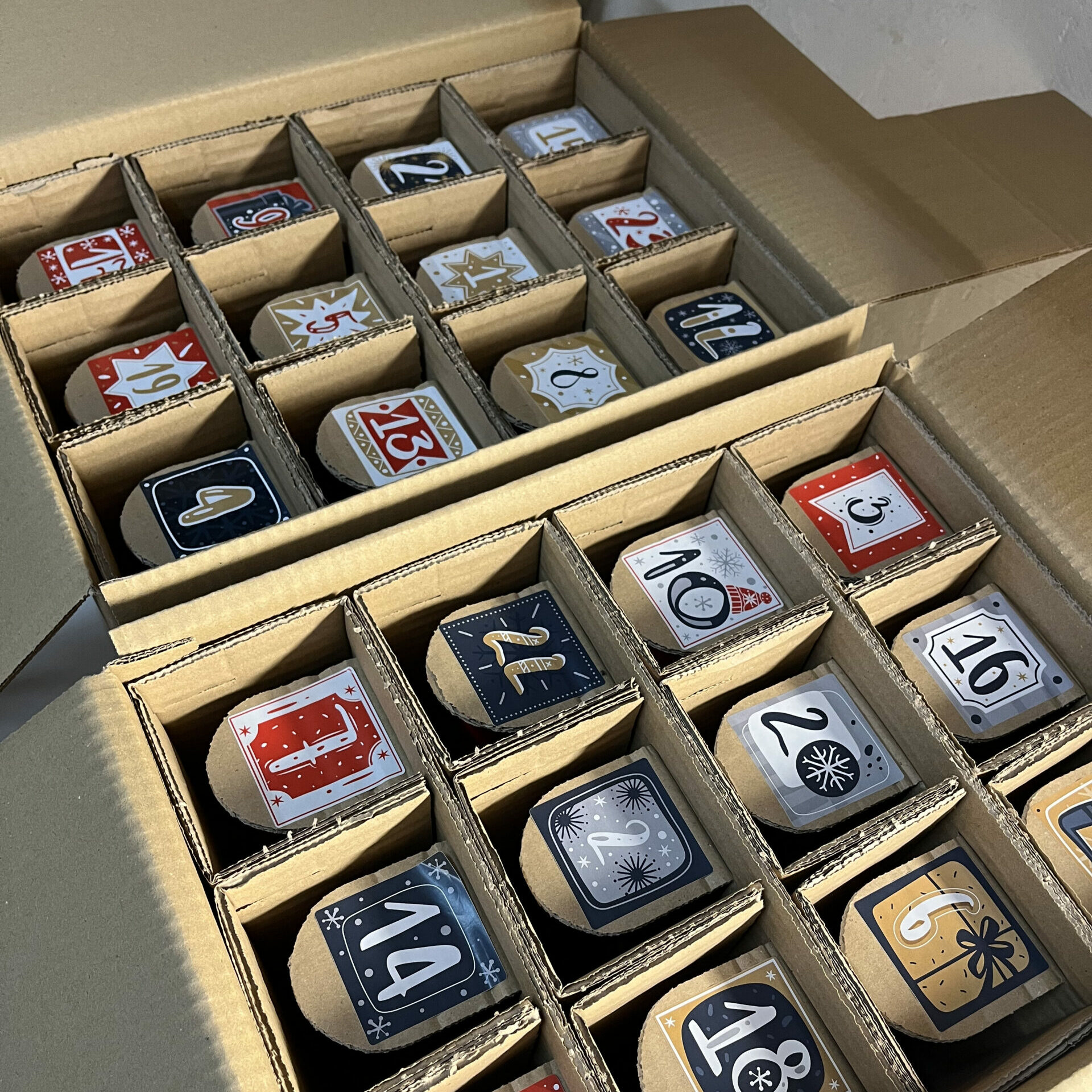 In diesem XXL Wein-Adventskalender sind 24 in Seidenpapier eingepackte Flaschen enthalten. Insgesamt sind es 20 Flaschen Wein von Rot bis Weiß und trocken bis süß, eine Flasche Secco, eine Flasche Sekt, eine alkoholfreie Alternative und ein Winzer-Glühwein. Somit können Sie ab dem 01.12 jeden Tag bis Heiligabend ein „Türchen“ aufmachen und den darin enthalten Wein auspacken.